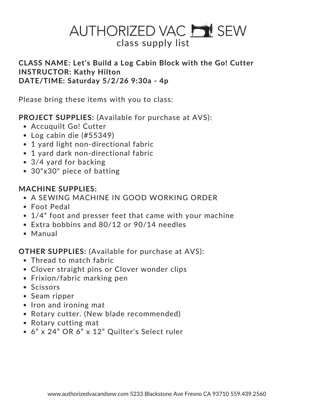 When registering for classes and events, a supply list is available on our website. All supplies should be purchased prior to class. Class participants will receive a 10% discount on all supplies purchased at AVS for class. If assistance is needed to prepare for class, an AVS employee will happily help. When specified, students should bring machines that are in good working order to class and have basic knowledge on how to use the machine.