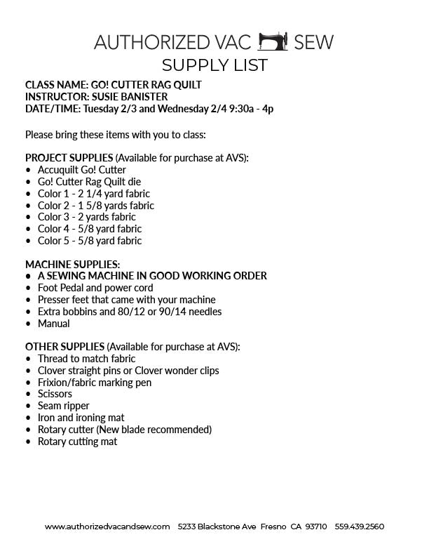 When registering for classes and events, a supply list is available on our website. All supplies should be purchased prior to class. Class participants will receive a 10% discount on all supplies purchased at AVS for class. If assistance is needed to prepare for class, an AVS employee will happily help. When specified, students should bring machines that are in good working order to class and basic knowledge on how to use the machine.