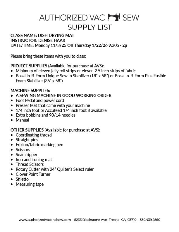 When registering for classes and events, a supply list is available on our website. All supplies should be purchased prior to class. Class participants will receive a 10% discount on all supplies purchased at AVS for class. If assistance is needed to prepare for class, an AVS employee will happily help. When specified, students should bring machines that are in good working order to class and basic knowledge on how to use the machine.