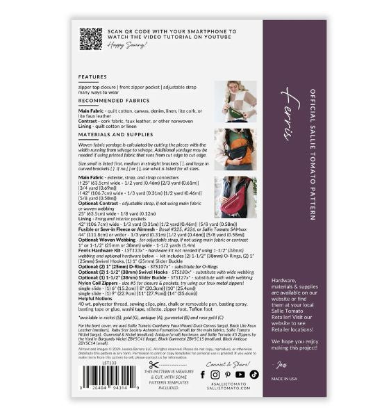 Make a clean, modern fanny pack fast. The Ferris pattern includes three sizes (Small, Medium, Large), all fully lined with a zipper top closure, front zipper pocket, and an adjustable strap. If you want a hands-free bag that’s actually wearable and not sloppy, this is it.