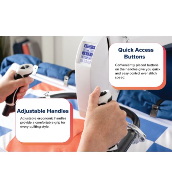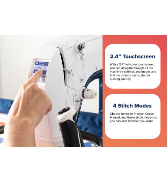 The Grace Q’nique 16X delivers long-arm control in a compact midarm. Its 2.4" color touchscreen puts lighting, stitch modes, and speed at your fingertips, while Edge Warning™ protects your design boundaries on any compatible Grace frame. Stitch regulation in Cruise and Precise modes keeps your stitch length even as you move, and Baste mode speeds up tacking down layers.
