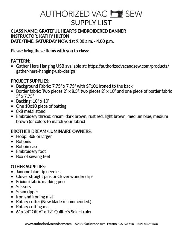 Stitch something special this season! Join Kathy to make the Grateful Heart banner from Embroidery Garden—a beautiful project full of autumn charm. Machines are provided; just bring your fabric and supplies for a creative day of embroidery fun!