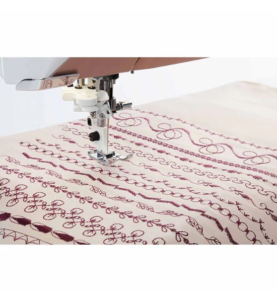- Spacious sewing area for quilts and bulky projects with a long free arm.