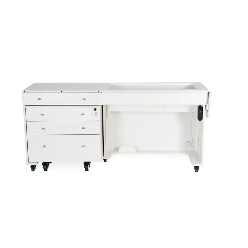 The Kangaroo XL & Joey is everything sewists love about our best-selling Kangaroo cabinet, now with even more room to create. Designed with a wider sewing machine opening (30-1/2" x 14-1/2"), this upgraded version – available in a smooth-action hydraulic lift or powerful, programmable, one-touch electric lift – accommodates today's largest machines. Whether you're free-motion quilting or piecing intricate blocks, the expansive work surface with collapsible side and rear leaves keeps your project supported and your workspace clear, while the Joey rolling storage cabinet provides three soft-close drawers for storage that rolls out when you need it and tucks away when you don’t.
