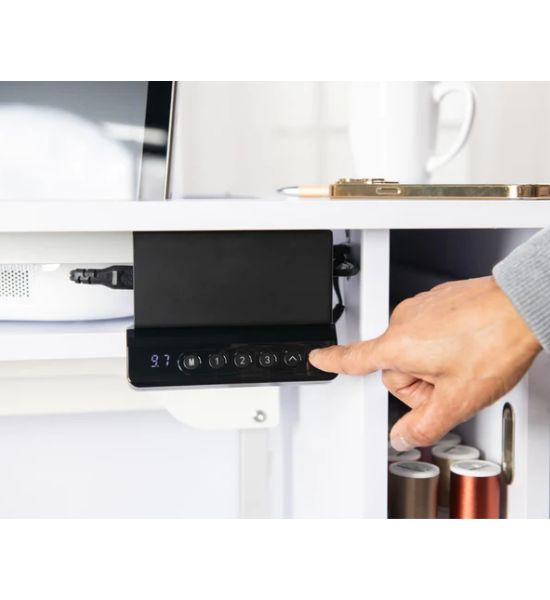- XL electric lift platform that raises and lowers your top-tier sewing/embroidery machine with one touch.