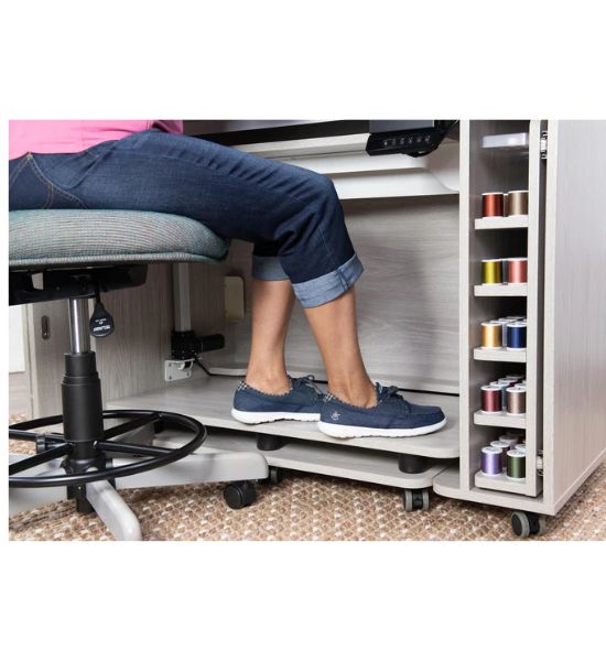 This is the cabinet built for the big embroidery machines and small sewing rooms. It parks as a clean, compact studio, then gives you a serious work surface, electric lift, glide-out embroidery storage, and a full thread closet when it’s time to actually get work done.