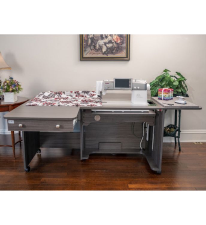 With a full-size footprint and smart expansions, the 8280 creates a true XL quilting workstation. The large drawer extension provides generous left-of-needle support (25-1/8" W x 16" D), helping control bulky quilts and reducing drag while stitching. A convenient 14" drop leaf gives you extra surface for rolling and maneuvering oversized projects, and the right-side swing-up platform adds more room for tools, rulers, thread, and everyday sewing essentials.