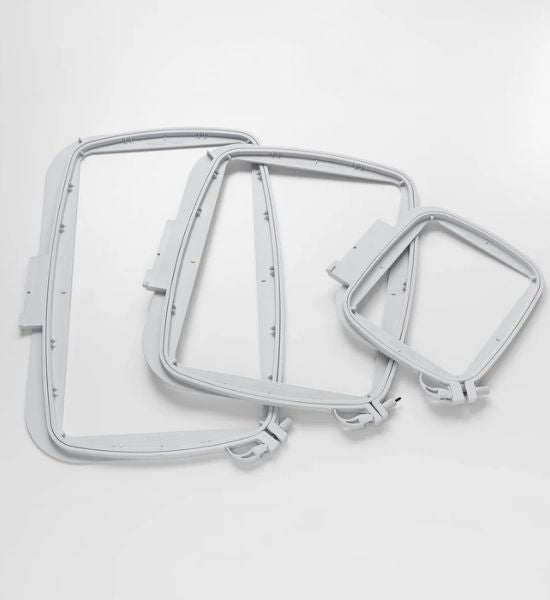 - Three embroidery hoops: DESIGNER™ Splendid Square Hoop (120x120 mm), DESIGNER™ Crown Hoop (260x200 mm), and DESIGNER™ Royal Hoop (360x200 mm)