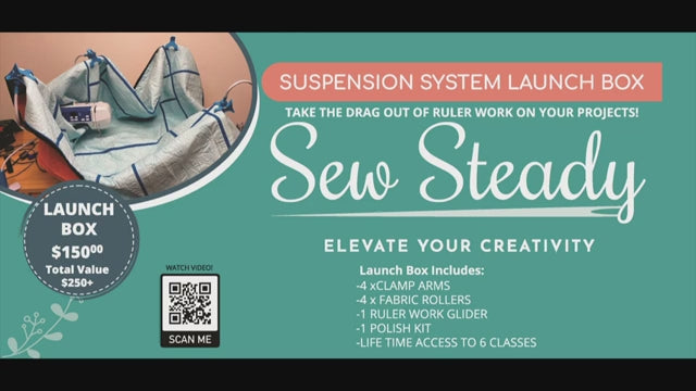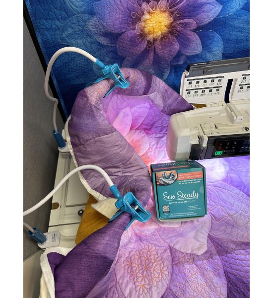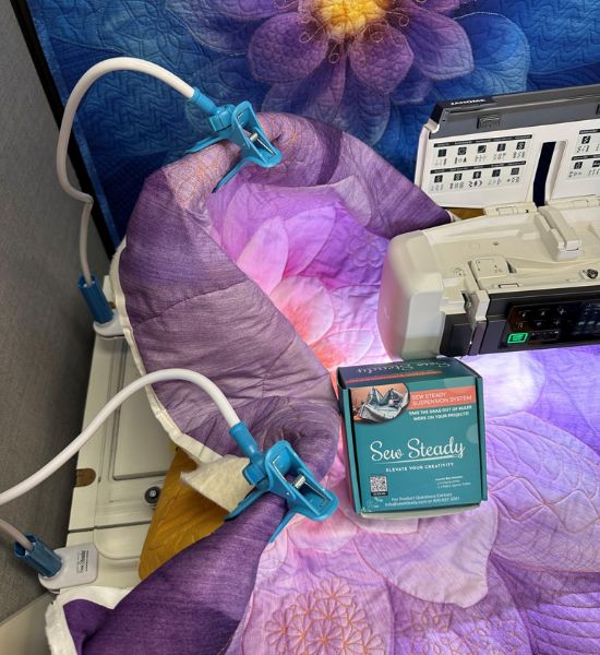 Finish quilt tops, quilt blocks, and other large projects with far less drag and fatigue using the Sew Steady® 2-Piece Suspension System. This compact support setup lifts the weight of your project while you sew, helping fabric flow smoothly and reducing strain on your body.