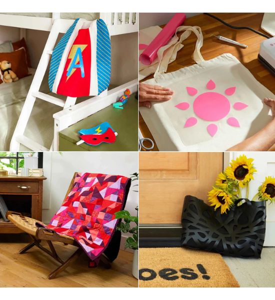 Cut 5 preset quilting shapes automatically — squares, triangles, and more — for quick, accurate patchwork assembly.
